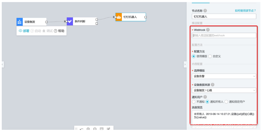 接下来在左侧节点列表的“功能”类拖入一个“钉钉机器人”节点。并与条件判断节点的上方出口(“满足条件”)进行连线。选择模板为“设备告警”模板,数据源选择“设备触发”“心跳”,可以选择@所有人。