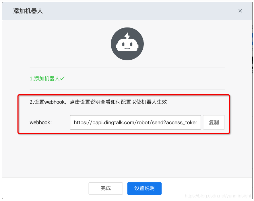 然后在完成页面可以看到webhook。整个复制下来,粘贴到输入框内。