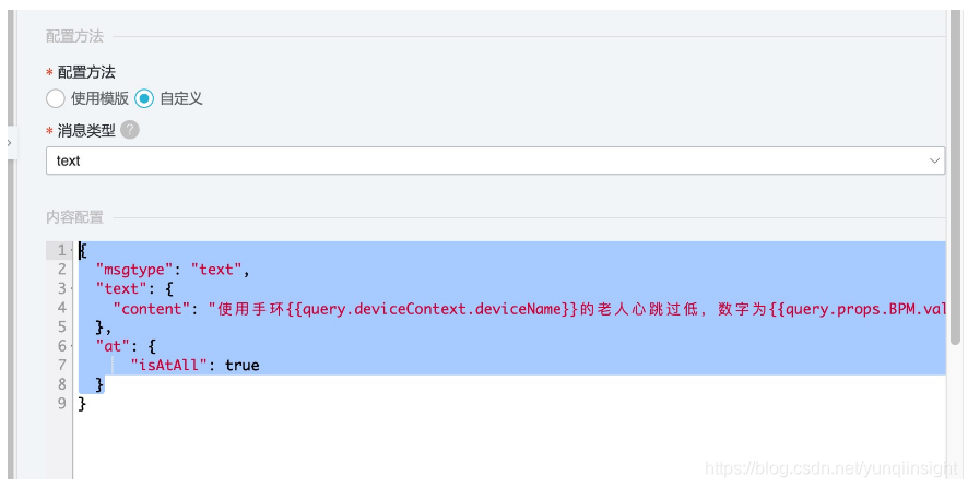 {"msgtype": "text", "text": {"content": "使用手环{{query.deviceContext.deviceName}}的老人心跳过低,数字为{{query.props.BPM.value}},大家快去看看吧!"}, "at": {"isAtAll": true}