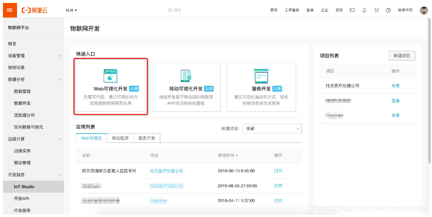 首先进入IoT Studio页,点击Web可视化开发,进入Web可视化页面。