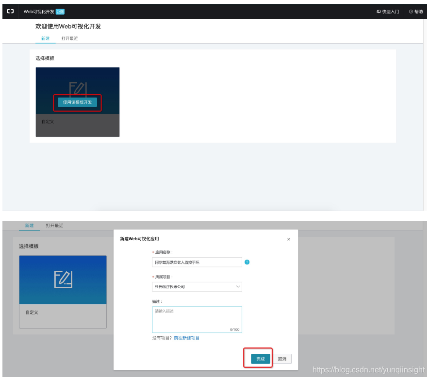然后新建一个空白模板,输入应用的名字,如“阿尔兹海默症示例应用”。