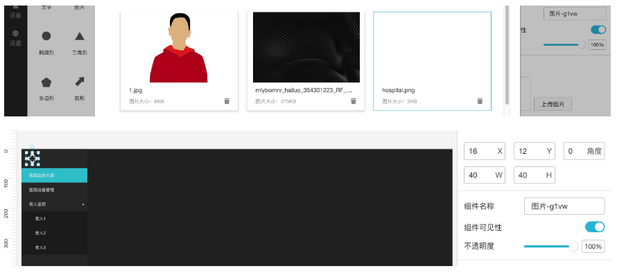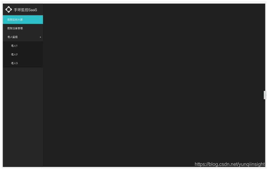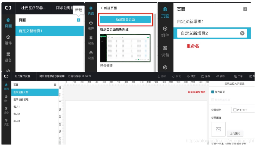 首先把整个应用的架构搭建好,创建5个页面,分别为医院监控大屏,医院设备管理,老人1的详情页,老人2的详情页,老人3的详情页。