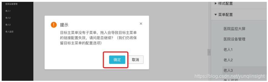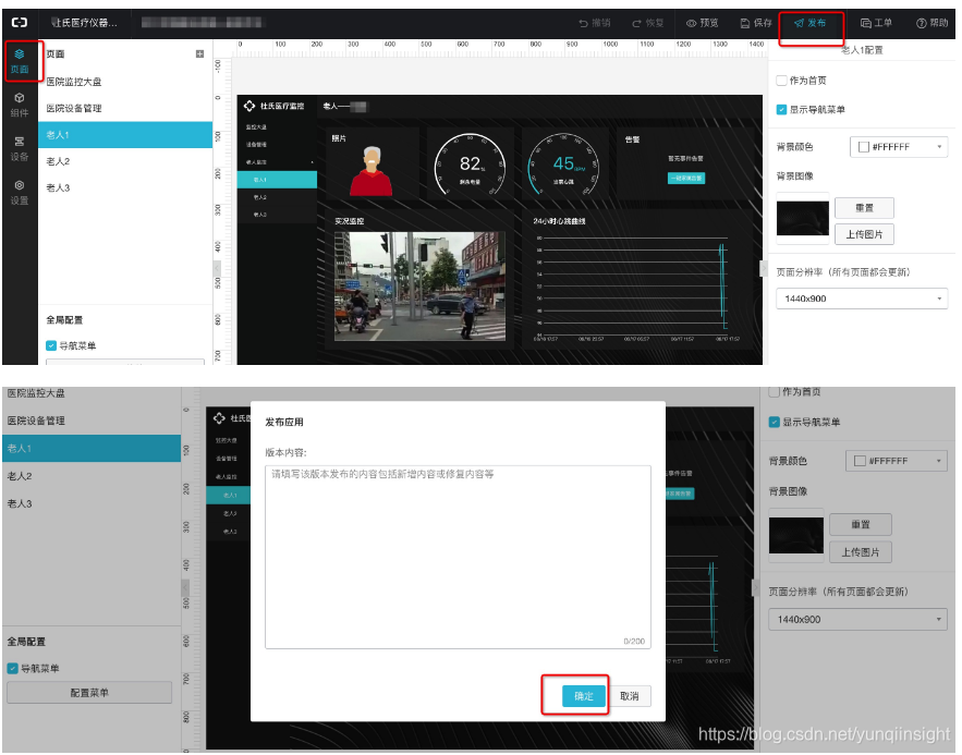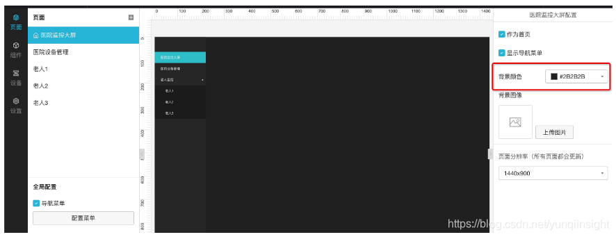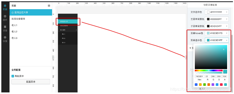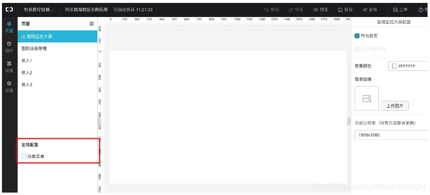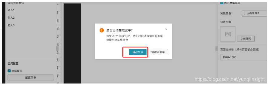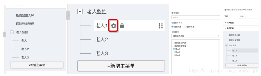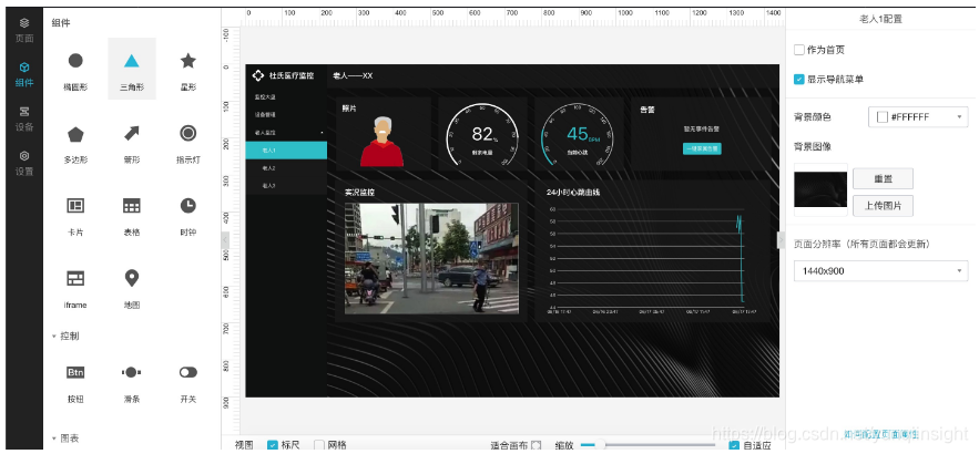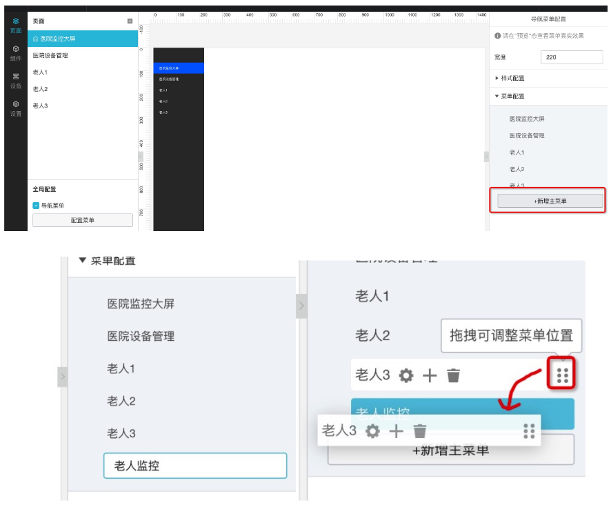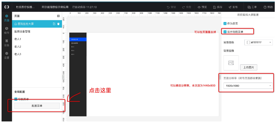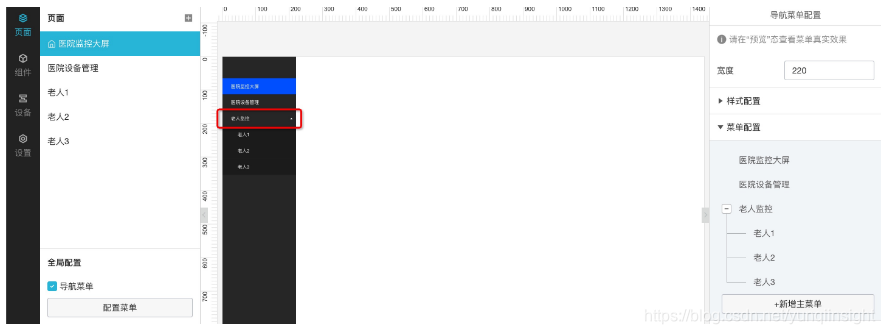 可以看到生成的左侧菜单栏,现在想把老人1,2,3三个页面归属到一个“老人监控”的主分类下,因此需要修改配置菜单项。点击左下角的“配置菜单”。此外这里修改了分辨率为1440x900。