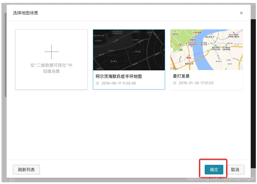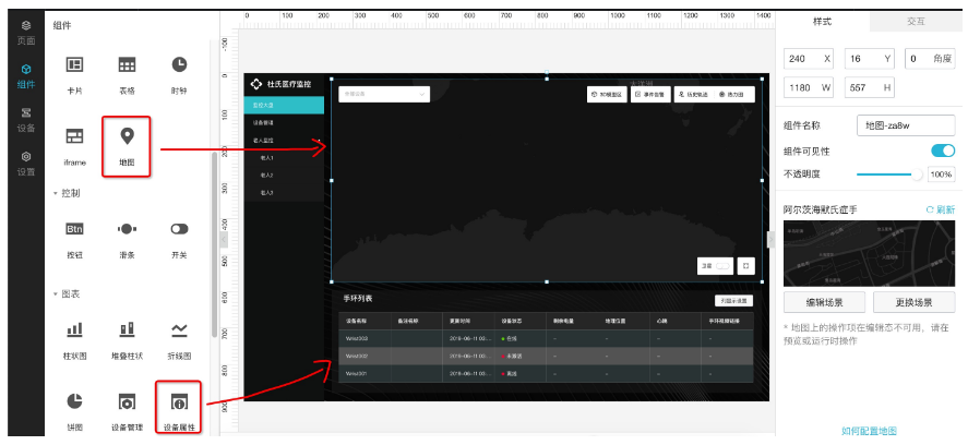 设备地图需要用到物联网平台数据分析功能的空间数据可视化服务。过程如下图gif显示,首先在左侧栏拖入地图组件,然后点击添加场景,前往空间数据可视化页面,然后点击添加,选择“阿尔兹海默症手环”产品,点击确定。