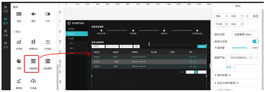 可以看到关联了产品后,表单自动显示产品下的全部设备。接下来我们可以修改一下右侧的配置项,让他的样式更符合黑色的背景。