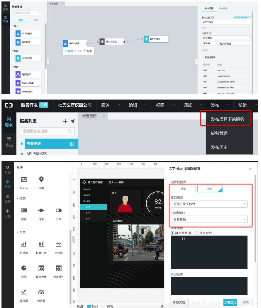 首先拖入一段文字组件,然后关联对应设备的对应事件(如老人摔倒),验证格式之后文字会显示事件的快照值以及输出参数。当然可以通过服务开发工作台的HTTP请求接口修改文字内容,定制化等。