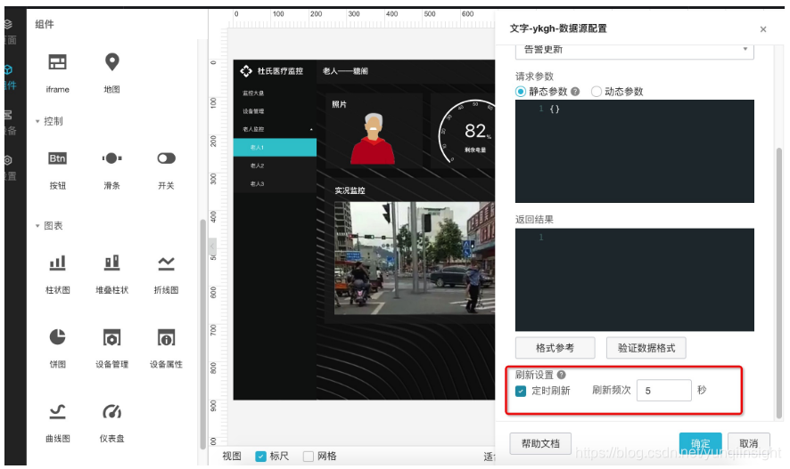 图片的实况监控,如之前说的我们获取了设备图片的url作为属性上报,我们可以使用“变量”机制,帮助iframe组件获取设备上报的属性。