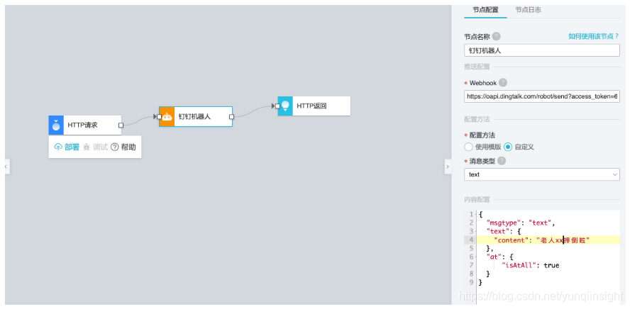 接下来是一个告警服务,比如短信通知家属,我们可以开通阿里云的短信服务或者钉钉机器人进行消息的输出,也可以用服务开发的“三方API”节点进行微信公众平台等三方输出。这里我们以钉钉机器人为例。