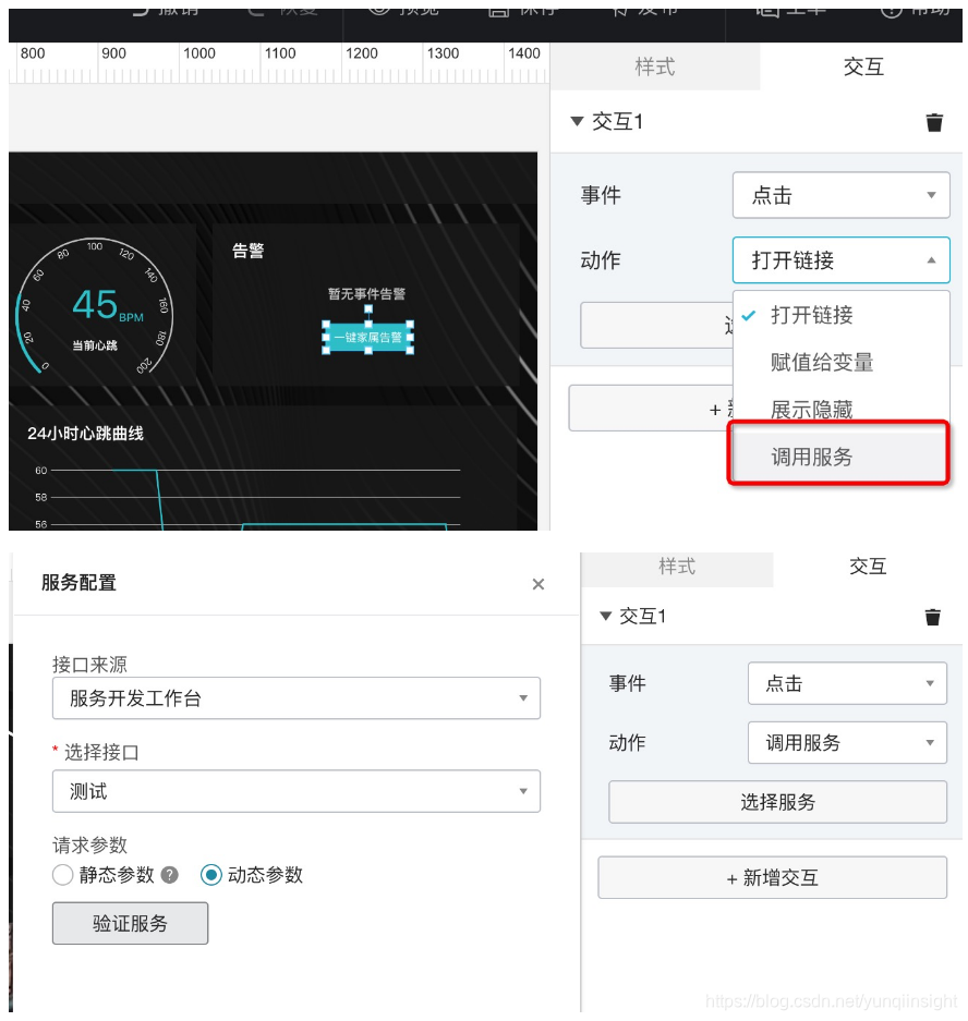 在按钮那里选择交互-点击-调用服务,选择对应的服务,验证即可看到钉钉机器人推送。