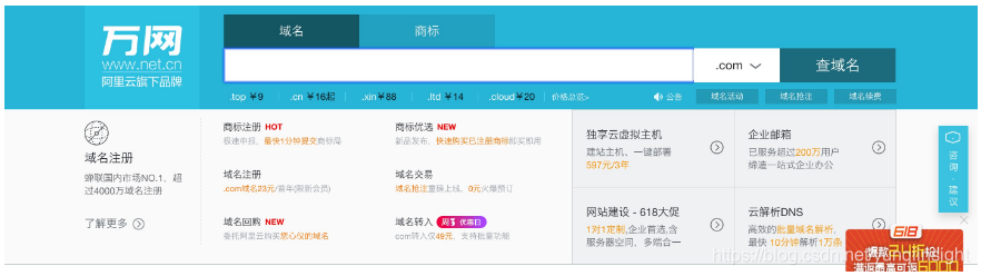 我们需要先在阿里云上申请一个域名,打开域名购买,购买一个域名。