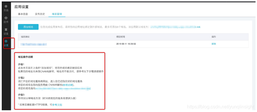 然后前往IoT Studio的Web可视化工作台的设置菜单,点击域名管理。按照引导流程处理进行域名解析。