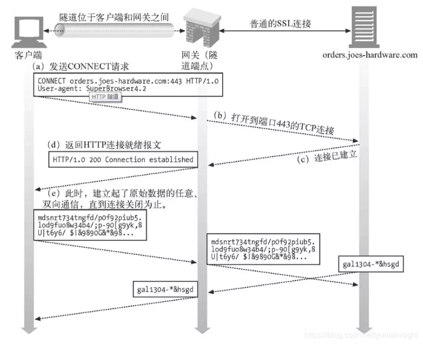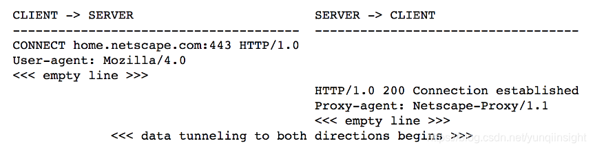 早在1998年,也就是TLS还没有正式诞生的SSL时代,主导SSL协议的Netscape公司就提出了关于利用web代理来tunneling SSL流量的INTERNET-DRAFT。其核心思想就是利用HTTP CONNECT请求在客户端和代理之间建立一个HTTP CONNECT Tunnel,在CONNECT请求中需要指定客户端需要访问的目的主机和端口。Draft中的原图如下: