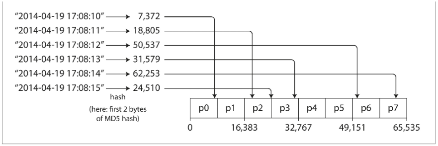 还有种拆分方法是散列(HASH)分区,分区数量和边界是确定的(后期可以做分区分裂)。这时各个数据的分布是否均衡就取决于各个产品实现机制。大部分做法是使用一个散列(HASH)函数对Key计算一个值,然后针分段存储。