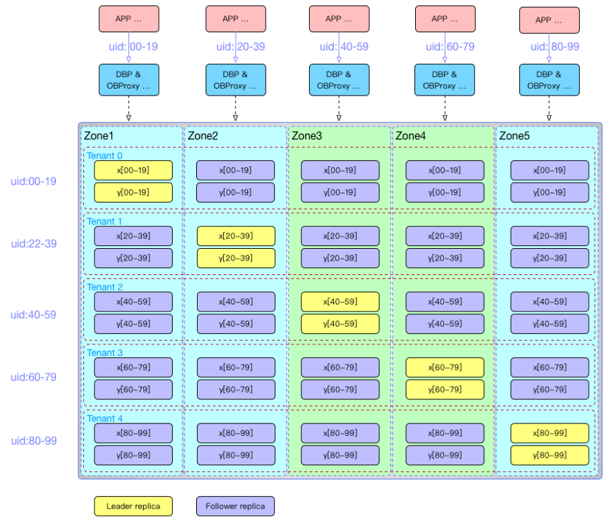 蚂蚁金服的业务规模非常大,业务模块划分非常细。以网商银行非常核心的交易、账务和支付模块举例,每个业务模块的数据经分布式数据库中间件(SOFA的DBP)拆分为多个OceanBase租户(实例)下百库百表,每个表同时变更为OceanBase自身的分区表,分为100个分区。总共有多个OceanBase集群,每个集群横跨杭州上海和深圳五机房,并同时提供服务。这里的数据总共分为10000个分区,不同分库下的数据分区的Leader副本分别位于不同的机房。不同分表之间可以分别进行结构变更(灰度发布能力),不同OceanBase租户甚至集群之间是物理隔离的,这是金融核心业务拆分有使用分库分表的第一个原因。