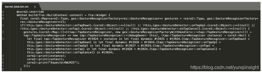 举个典型的场景,如果需要注入的dart代码里,x.dart文件的类y定义了一个私有方法m或者成员变量p,那么在aop_impl.dart中是没有办法对其访问的,更不用说多个连续的私有变量属性获得。另一方面,仅仅对方法整体进行操作可能是不够的,我们可能需要在方法的中间插入处理逻辑。