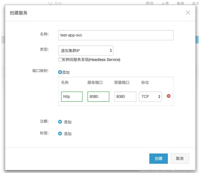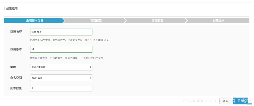 - 配置服务,服务名称为istio-app-svc,类型为虚拟集群 IP ,服务端口和容器端口均为8080