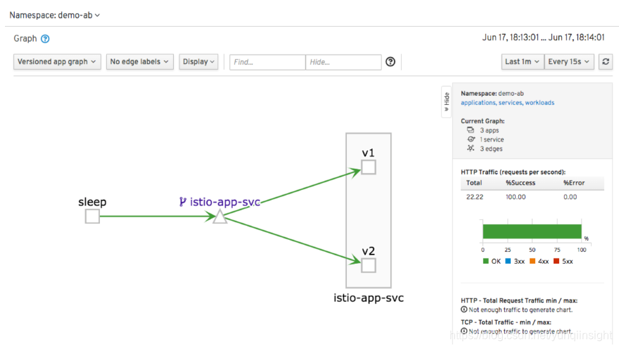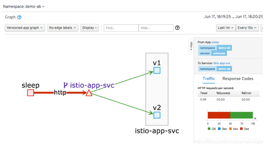 Hello from v2同时,在 kiali 可视化界面中,也可以看到 sleep 服务对 istio-app-svc 服务的调用有 50% 左右的失败比例