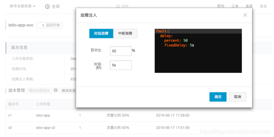 - 除此之外,我们也可以为服务注入时延故障,例如在上述界面中,选择时延故障,为 50% 的请求添加 5s 的时延