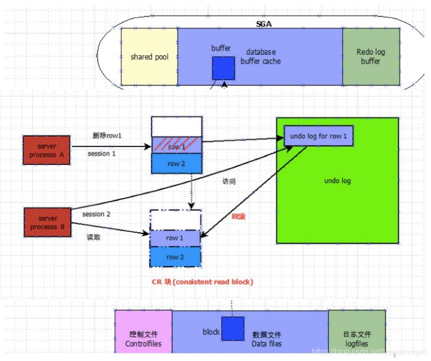 ORACLE会话第一次修改一行记录,如果该记录所在块(8K大小)不在内存(Buffer Cache)里时会先从磁盘文件里读入到内存里。这个称为一次物理读,为了性能考虑,ORACLE一次会连续读取相邻的多个块。然后就直接在该块上修改,修改之前会先记录REDO和UNDO(包括UNDO的REDO)。然后这个数据块就是脏块(Dirty Block)。假设事务没有提交,其他会话又来读取这个记录,由于隔离级别是读已提交(READ COMMITTED),ORACLE会在内存里克隆当前数据块到新的位置,新块包含了最新的未提交数据。然后ORACLE在新块上逆向应用UNDO链表中的记录,将数据块回滚到读需要的那个版本(SCN),然后才能读。这个也称为一次一致性读(Consistency Read),这个新块也称为CR块。