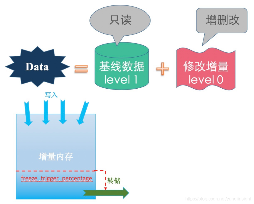 当业务压测写OB时,脏块的量也会增长,最终达到增量内存限制,这时候业务就无法写入,需要OB做合并释放内存。OB的合并比较耗IO、CPU(有参数可以控制合并力度),并且也不会等到内存用尽才合并,实际会设置一个阈值。同时为了规避合并,设计了一个转储机制。当增量内存使用率超过阈值后,就开启转储。转储就是直接把增量内存写到磁盘上(不合并)。转储对性能的影响很小,可以高峰期发生,并且可以转储多次(参数配置)。