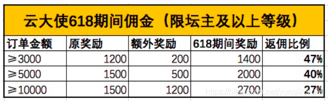 618期间(6.17-6.30)云大使推广任意首购订单加码额外激励,最高新增1200元返佣,真实返佣高达47%;推广3000元及以上订单可获1400元返佣、推广5000元及以上订单可获2000元返佣、推广10000元及以上订单可获2700元返佣;具体如下图: