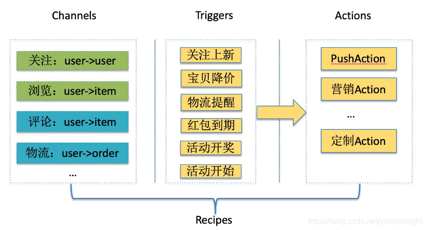 首先按照IFTTT规范对业务进行建模,分为Channel、Trigger和Action层,其中Channel层是数据底层,将Trigger和Action关联后组成标准Recipe。