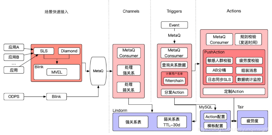 而现在的场景快速接入方案解决了这些问题,通过SLS接入所有应用的海量网络请求日志,记录请求的URL、参数和响应;将SLS作为Blink流计算任务的数据源;根据diamond动态下发的规则实时筛选网络请求URL和参数,把数据按照指定格式组装后上报给Channel层。