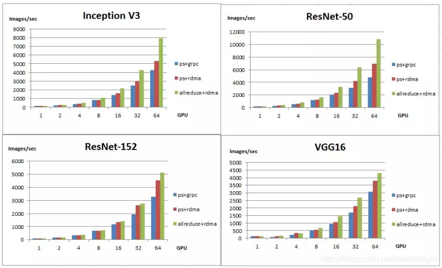 - 上面4个图分别是 Inception v3、ResNet-50、ResNet-152、VGG16 这四个模型的性能测试数据;