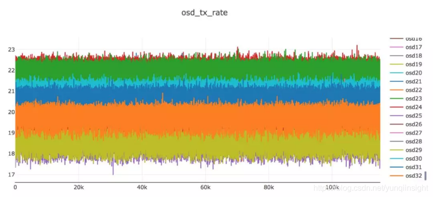 为了实现 RoCE 的性能优势,以太网需要提供一个无损网络做为基础,否则对性能的负面影响非常大。以太网的无损机制主要通过端到端的 QoS 来实现,即所有的QoS 机制需要在服务器和交换机上做统一的设置,包括 DSCP、队列、DCQCN、ECN、PFC 等。通过使用这些技术,能够保证在 burst,incast 等 IO 场景下 RDMA也有稳定的表现。下图是在一个32个节点的集群中做长时间压测时采集到的发送带宽,可以看到各个节点的带宽非常稳定。