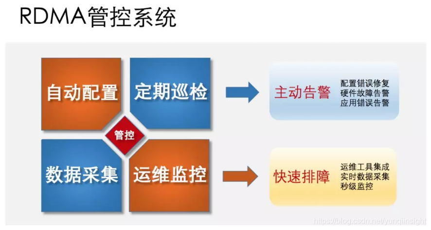 RoCE 技术虽然有很多技术优势,但是它对无损网络的要求也导致网络配置非常复杂,除了新增很多网络设备的管控配置,同时也把之前相对独立的网卡设备纳入了网络运营的范围,大大增加了运营的内容和难度。与此相适应,在主机上需要安装专门的 RDMA 软件平台包,包括网卡驱动、用户库和管控软件等部件。这些软件可以做到一键部署、自动配置和定期巡检,并且与相应的监控系统都有数据对接。通过安装这些软件包,就可以做到及时发现物理网络的配置错误,硬件故障,让应用远离复杂的网络管理,顺利享受 RDMA 带来的技术红利。