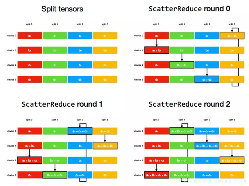 ScatterReduce 阶段:通过 num_devices - 1 轮通信和相加,在每个 device 上都计算出一个 tensor 分片的和;