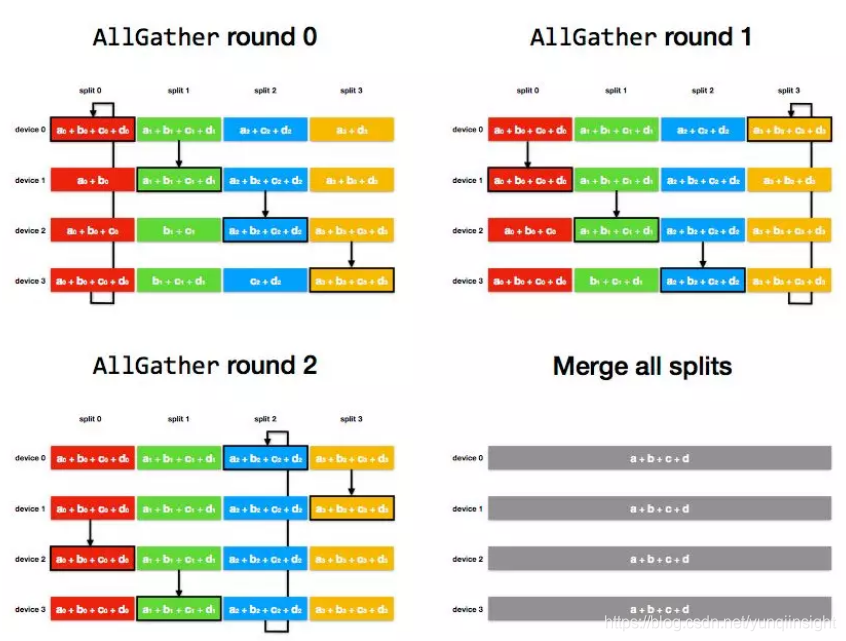 经过 num_devices - 1 轮后,每个 device 上都每个 tensor 分片都得到了这个分片各个 device 上的和;由上例可以看出,一次 Ring Allreduce 中单个节点总的通信数据量是