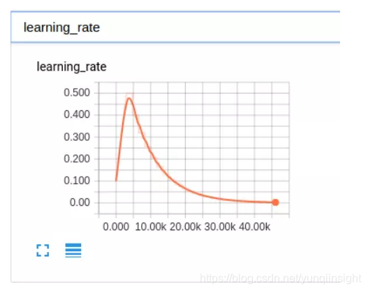 2.使用 PaiSoar 中的 learning rate 动态调节方法smooth_exponential_decay,在训练初期采用 lr(learning rate) 平滑上升的策略,训练刚开始时,使用一个较小的 lr,尽量避免一开始由于 lr 太大导致收敛不稳定。后面再平滑增大 lr,尽量让 weights 更新到离初始的 init weight 比较远的地方。lr 增长到目标值后再采用指数衰退的方式,每个几个 epoch 衰退一次,逐步减少 lr,避免训练后期过大的 lr 导致训练波动,不收敛,learning rate 变化趋势如下图所示: