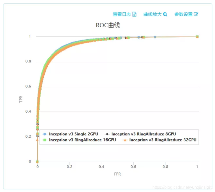 在16机(32 GPU卡)下绿网模型在20个小时收敛,比单机(2 GPU卡)快了14.4倍,完成一天内训练收敛的目标。同时对所有分布式训练的模型使用了安全部的的火眼平台进行 ROC 测试,测试集有4万多条数据。经测试,分布式模型效果和单机2 GPU卡效果一致: