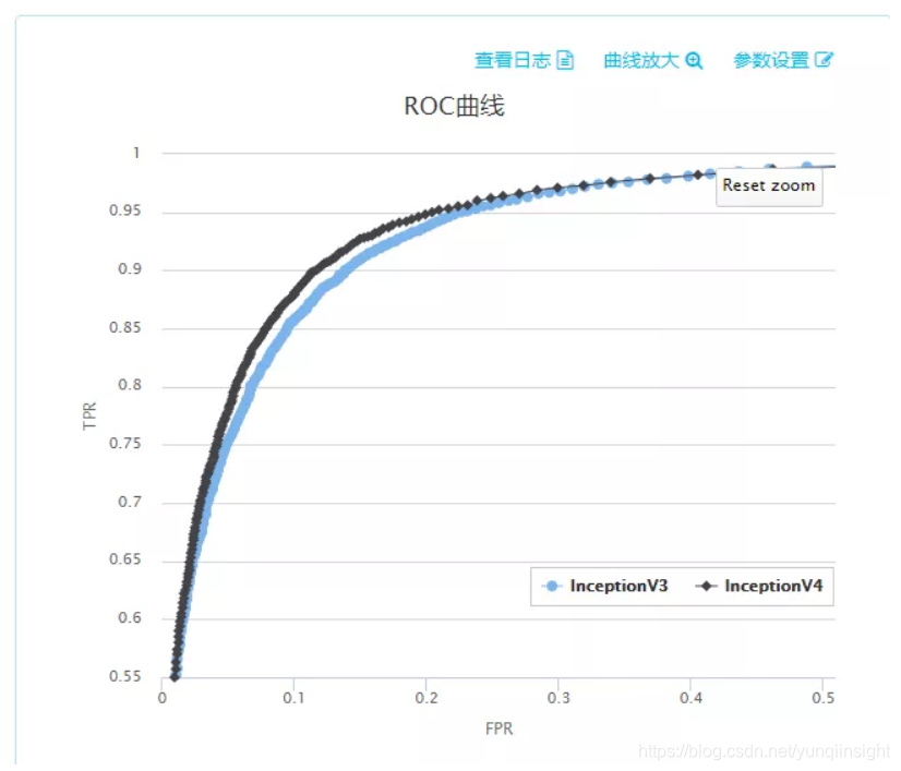 我们通过分布式训练加快了绿网模型的收敛,这时就可以尝试采用更复杂的神经网络结构来提高 AUC,之前绿网模型内使用的是 Inception v3 结构,我们升级到 Inception v4 进行测试,发现 ROC 曲线提升明显: