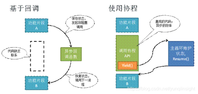 在多线程的代码下,除了启动线程的地方,是和正常的执行顺序不同以外,其他的基本都还是比较近似单线程代码的。但是如果在异步并发的代码下,你会发现,代码一定要装入一个个“回调函数”里。这些回调函数,从代码的组织形态上,几乎完全无法看出来其预期的执行顺序,一般只能在运行的时候通过断点或者日志来分析。这就对代码阅读带来了极大的障碍。因此现在有越来越多的程序员关注“协程”这种技术:可以用类似同步的方法来写异步程序,而无需把代码塞到不同的回调函数里面。协程技术最大的特点,就是加入了一个叫yield的概念,这个关键字所在的代码行,是一个类似return的作用,但是又代表着后续某个时刻,程序会从yield的地方继续往下执行。这样就把那些需要回调的代码,从函数中得以解放出来,放到yield的后面了。在很多客户端游戏引擎中,我们写的代码都是由一个框架,以每秒30帧的速度在反复执行,为了让一些任务,可以分别放在各帧中运行,而不是一直阻塞导致“卡帧”,使用协程就是最自然和方便的了——Unity3D就自带了协程的支持。