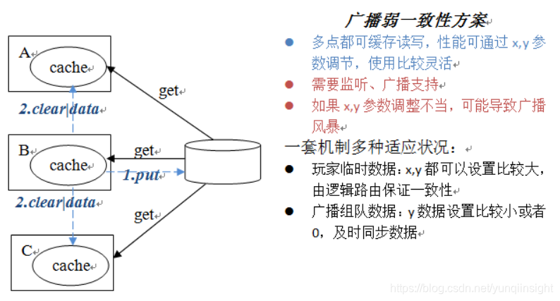 l 修改广播。上面两种策略,都需要维护一份缓存数据的租约,但是本身对于租约的操作,就是一种比较耗费性能的事情。所以有时候可以采用一些更简单,但可能承受一些不一致性的策略:对于读操作,每个节点的读都建立缓存,每次读都判断是否超过预设的读冷却时间x,超过则清理缓存从持久化重建;对于写操作,么个节点上都判断是否超过预设的写冷却时间y,超过则展开清理操作。清理操作也分两种,如果数据量小就广播修改数据;如果数据量大就广播清理通知回写到持久化中。这样虽然可能会有一定的不一致风险,但是如果数据不是那种要求太高的,而且缓存命中率又能比较有保障的话(比如根据KEY来进行一致性哈希访问缓存进程),那么真正因为写操作广播不及时,导致数据不一致的情况还是会比较少的。这种策略实现起来非常简单,无需一个中心节点进程维护数据租约,也无需复杂的判断逻辑进行同步,只要有广播的能力,加上对于写操作的一些配置,就能实现高效的缓存服务。所以“修改广播”策略是在大多数需要实时同步,但数据一致性要求不高的领域最常见的手段。著名的DNS系统的缓存就是接近这种策略:我们要修改某个域名对应的IP,并不是立刻在全球所有的DNS服务器上生效,而是需要一定时间广播修改给其他服务区。而我们每个DSN服务器,都具备了大量的其他域名的缓存数据。
