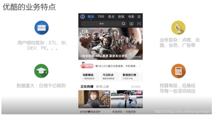 第二个特点就是业务复杂,优酷是一个视频网站,它有非常复杂的业务场景,从日志分类上,除了像页面浏览,还会有一些播放相关的数据、性能相关的数据。从整个的业务模式上,有直播、有会员、有广告、有大屏等这样一些非常不一样的场景。