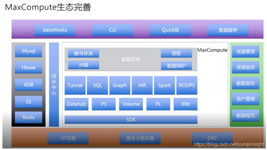 第二个特点,完整的生态。优酷在2017年之前是完全基于Hadoop的生态,迁到MaxCompute之后,是基于阿里云提供的Serverless大数据服务的生态。大家可以在开源上看到的组件,在整个的MaxCompute上都是有的,而且比开源的要更好用、更简单。从架构图上可以看到,我们中间是MaxCompute,左侧依赖的Mysql、Hbase、ES、Redis这些都是由同步中心去做一个双向的同步。右侧会有资源管理、资源监控、数据监控,包括数据资产,还有一些数据规范。我们下层的数据输入,包括一些集团的采集工具,再往上边,有提供给开发人员用的DataWorks,包括一些命令行的工具;有提供给BI人员用的QuickBI及数据服务。