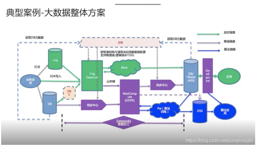 包括DB的同步,除了实时的链路,DB也会去通过按天/按小时,把数据同步到MaxCompute,数据计算结果也可以同步到Hbase、Mysql这种DB上面。再通过统一的服务层对应用提供服务。下面这个是机器学习Pai做的一些算法训练,再把训练的结果通过OSS传到一个算法的应用上面去。
