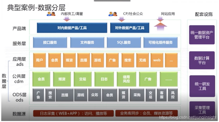 这张图可能也是业界比较流行的一个数仓分层的图,因为我们这边是数据中台,所有的数据都是统一从ods层cdm层,然后ads层,去一层一层的往上去做精细,再到最上面,通过接口服务、文件服务、SQL服务,去提供多样化的服务。再往上面,提供对内的一些数据产品,对高管、对小二,可能还有一些对外的,比如说像优酷的播放数,包括热度这些对应用的数据。