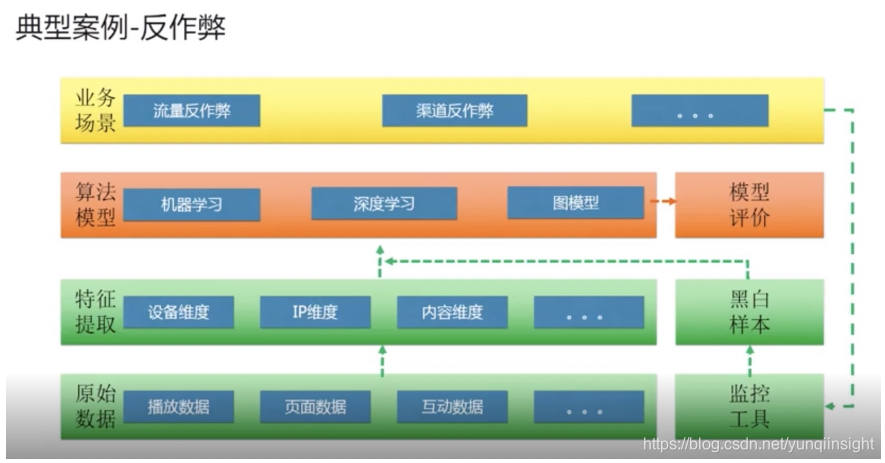 这张图大部分互联网公司不太会涉及到,就是关于反作弊的问题。这个是我们在MaxCompute做的一个反作弊的架构,通过原始的数据去提取它的特征,然后再通过算法模型,包括机器学习、深度学习、图模型去支持流量反作弊、渠道反作弊等等。再通过业务场景上反作弊的监控工具,把监控到的作弊信息去打一个黑白样本,再把这个黑白样本跟特征一起来不断的迭代优化算法模型。同时针对算法模型,做一个模型的评价,不断来完善反作弊体系。