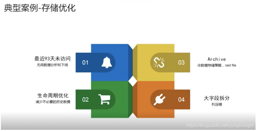 第一个,还是通过大数据来治大数据,去看哪些表它的访问不够或者它的访问跨度不够。就是对一些生命周期的优化,来去控制它的增速。包括下面的,刚才提到的Aliorc,实际上是做压缩的,我们会去做一些大字段的拆分,来提高压缩的比例。