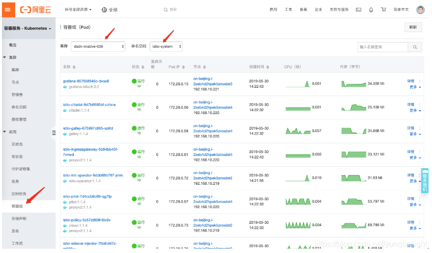 在容器服务左侧的容器组页面中选择 Kubernetes 集群和 istio-system namespace 确认运行状态,如下所示。
