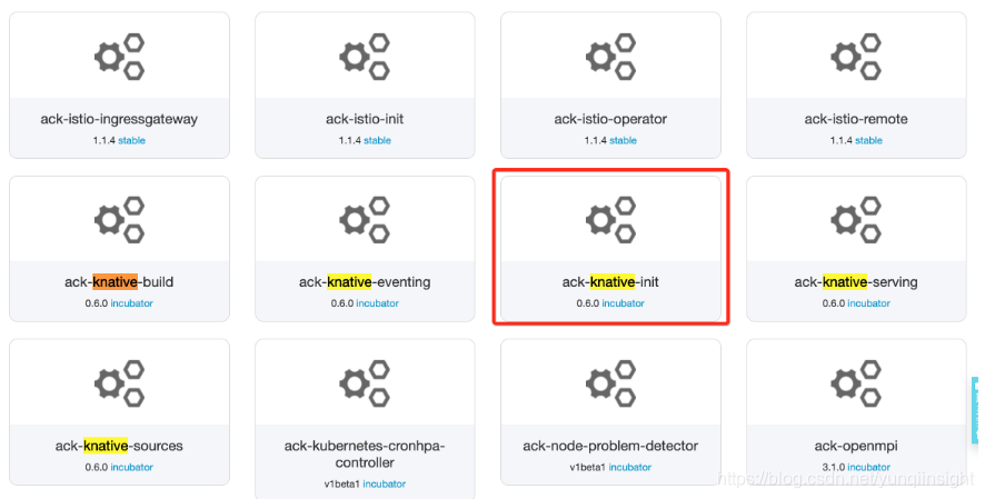 登录容器服务管理控制台,点击左侧的应用目录,在右侧选中 ack-knative-init,如下:
