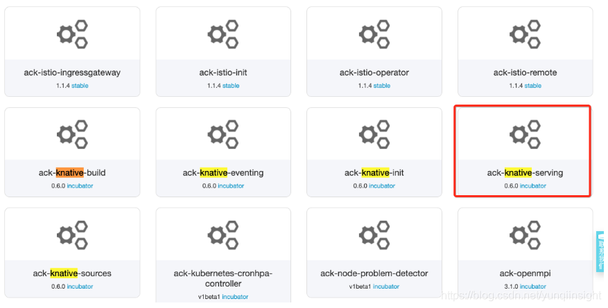 登录容器服务管理控制台,点击左侧的应用目录,在右侧选中 ack-knative-serving,如下: