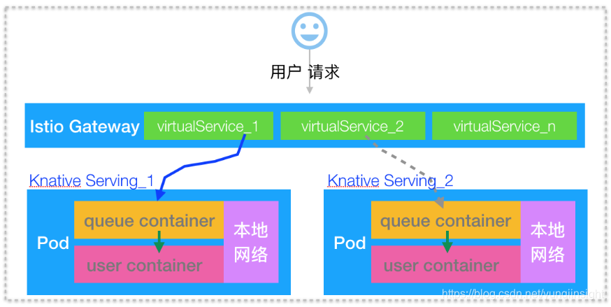 在访问 helloworld-go 之前我要先来介绍一下在 Knative 模型中流量是怎么进来的。Knative Service 和 Kubernetes 原生的 Deployment 不一样,Knative 不会创建 Loadbalance 的 Service,也不能创建 NodePort 类型的 Service,所以不能通过 SLB 或者 NodePort 访问。只能通过 ClusterIP 访问。而 ClusterIP 是不能直接对外暴露的,所以必须经过 Gateway 才能把用户的流量接入进来。本例就是使用 Istio 的 Gateway 承接 Knative 的南北流量(进和出)。如下图所示是 Knative 模型中流量的转发路径。用户发起的请求首先会打到 Gateway 上面,然后 Istio 通过 VirtualService 再把请求转发到具体的 Revision 上面。当然用户的流量还会经过 Knative 的 queue 容器才能真正转发到业务容器,关于这方面的细节我在后续的文章再进行详细的介绍。