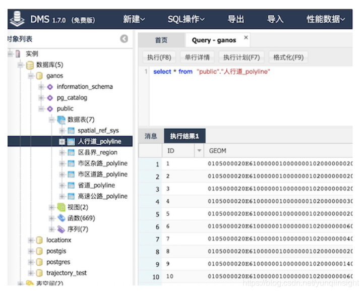 首先,需要通过阿里云主页购买RDS PostgresSQL、POLARDB for PG或POLARDB for Oracle实例(见文末链接,其中POLARDB for PG/Oracle目前可免费申请公测),并通过SQL插入或shp2pgsql工具导入矢量数据。数据导入后,可以通过控制台自带的DMS工具查看所导入的数据: