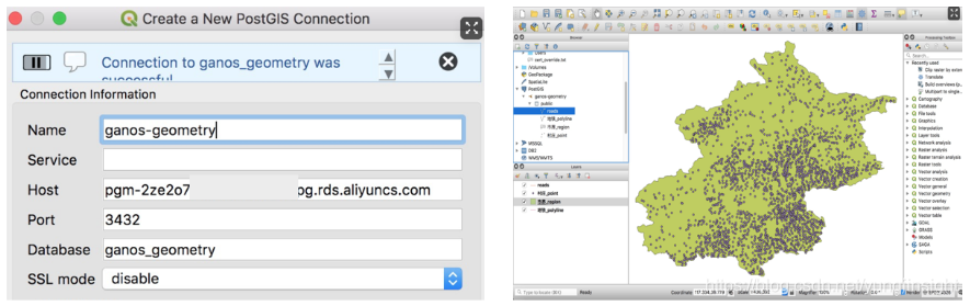 (1)QGIS连接Ganos,可浏览、查看、编辑、分析Ganos中的空间数据。