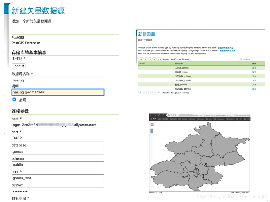 (2)GeoServer连接Ganos,可以将矢量数据发布为WMS,WFS等服务,实现地理空间数据的快速共享应用。